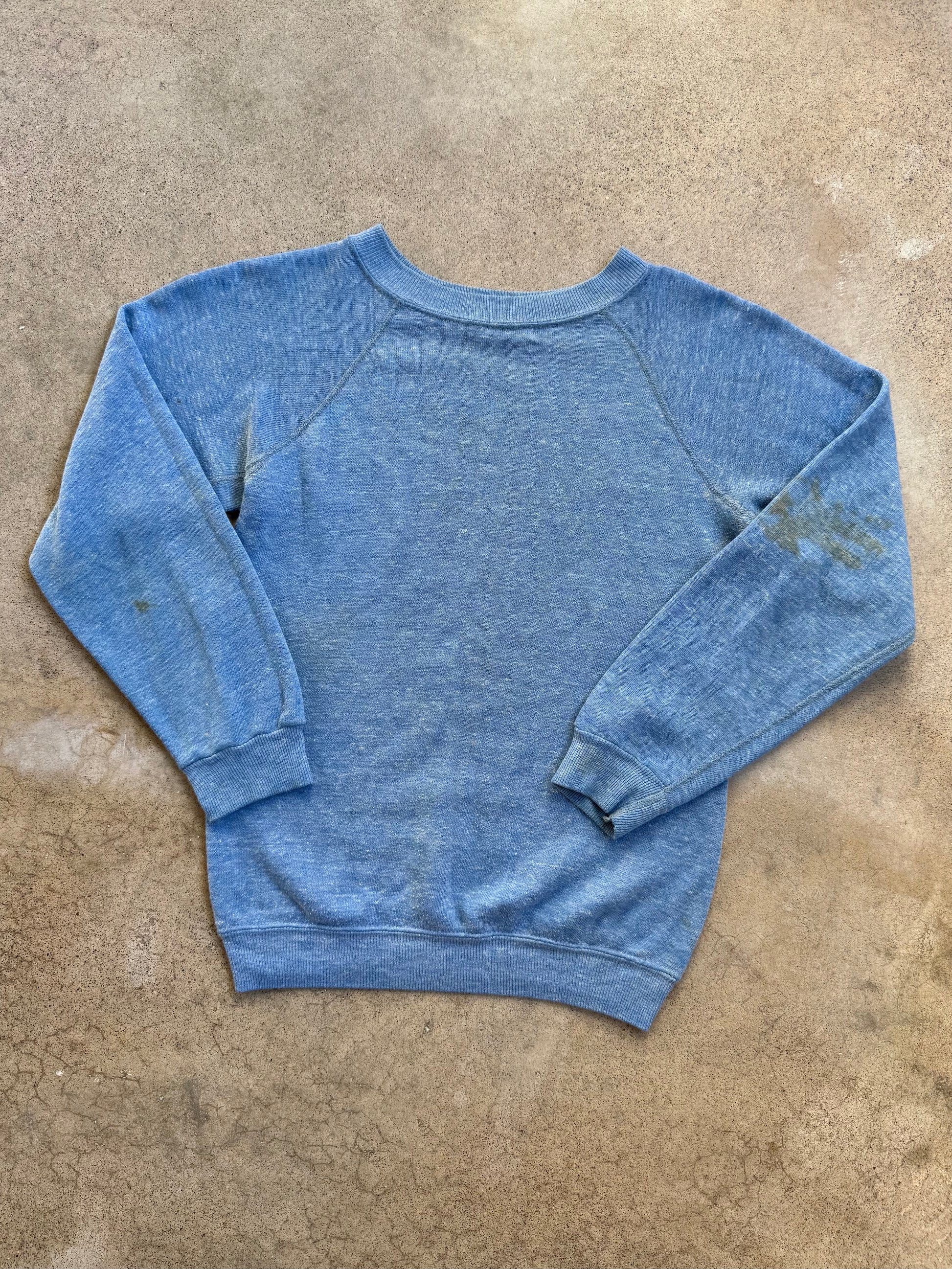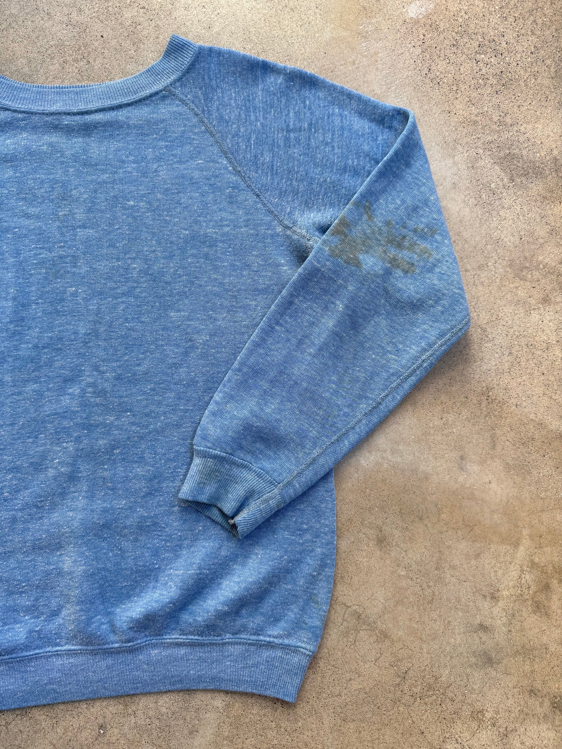 Vintage 1980s Heather Blue Worn & Stained Raglan Sweatshirt.