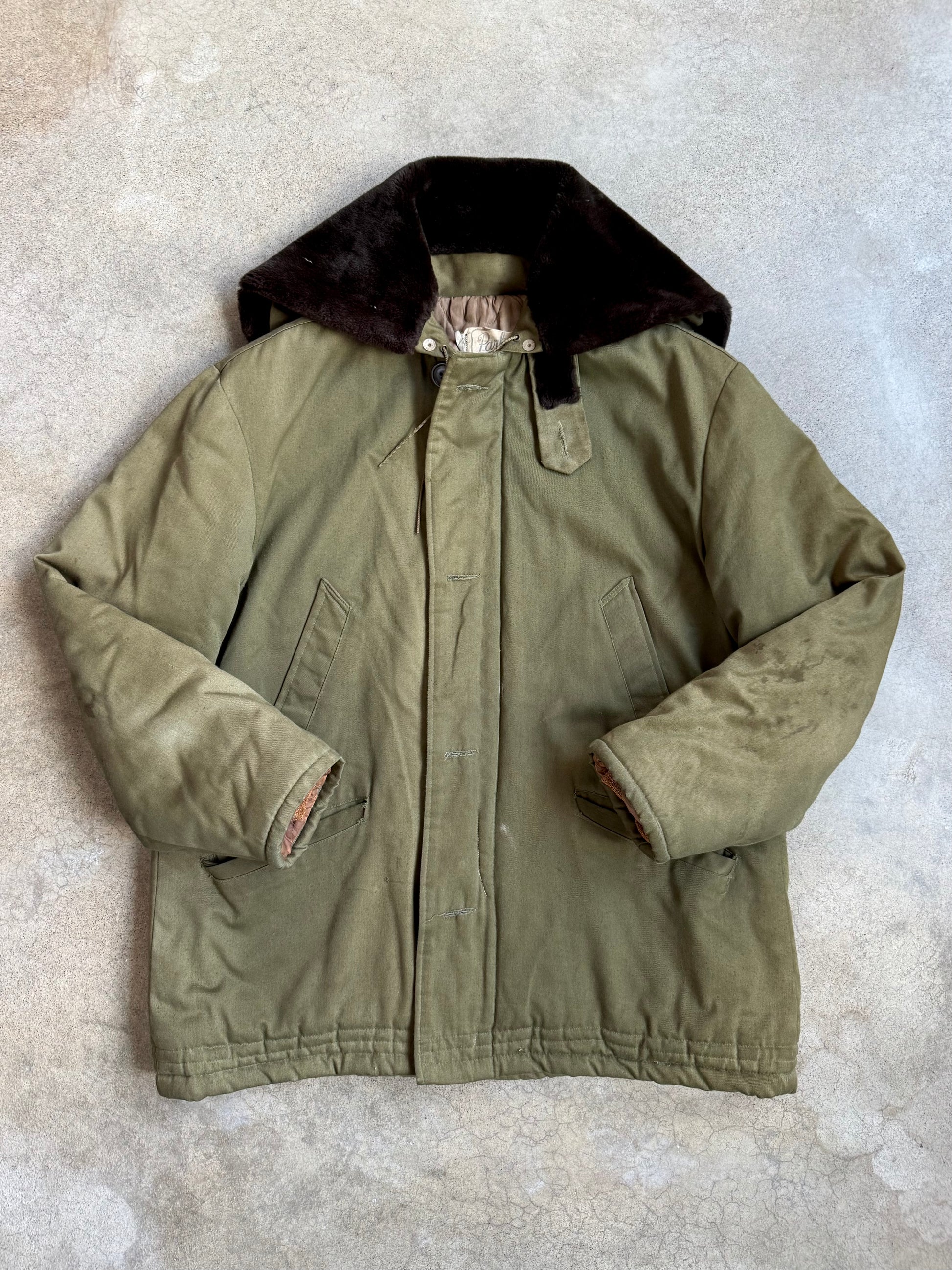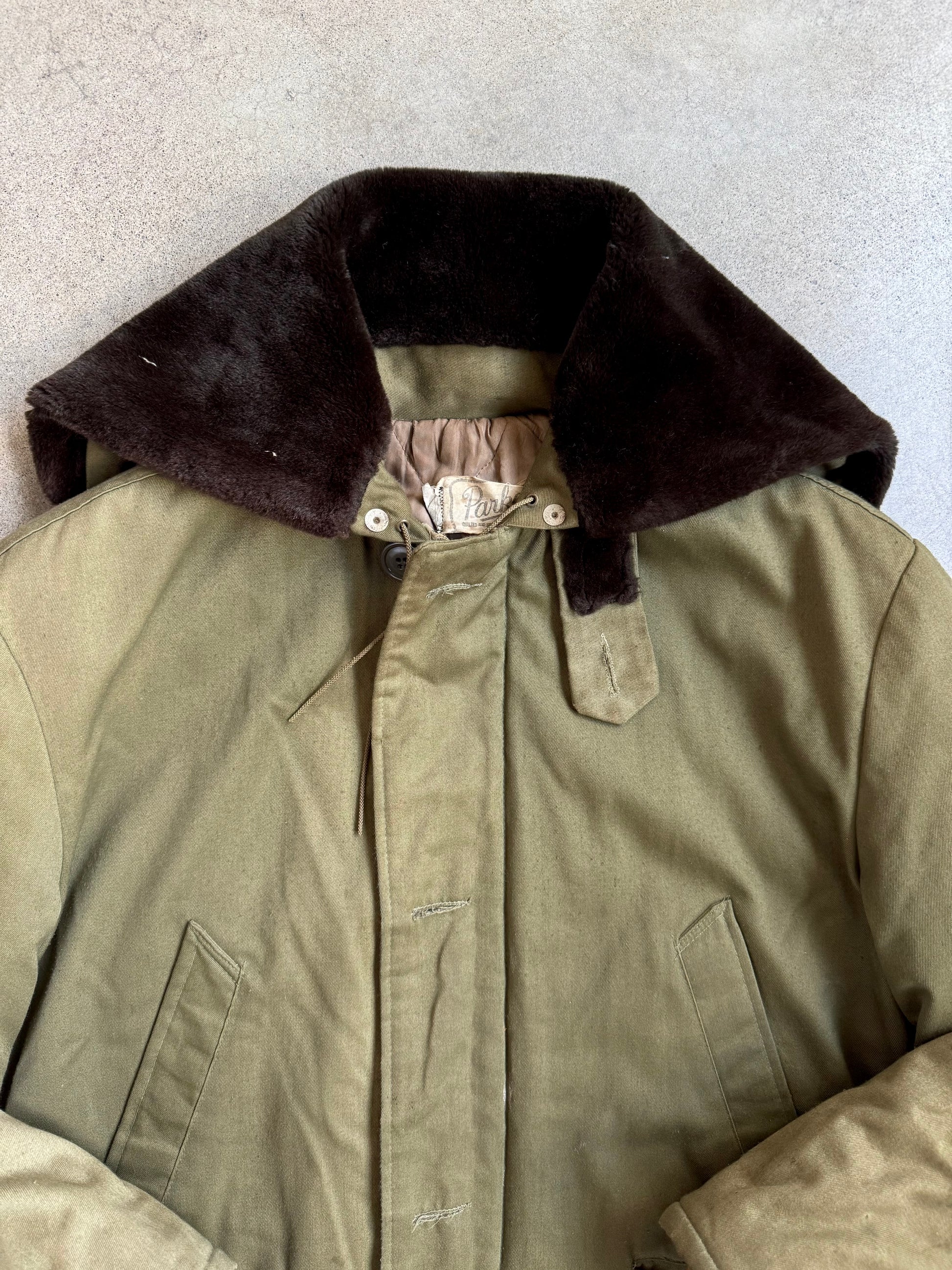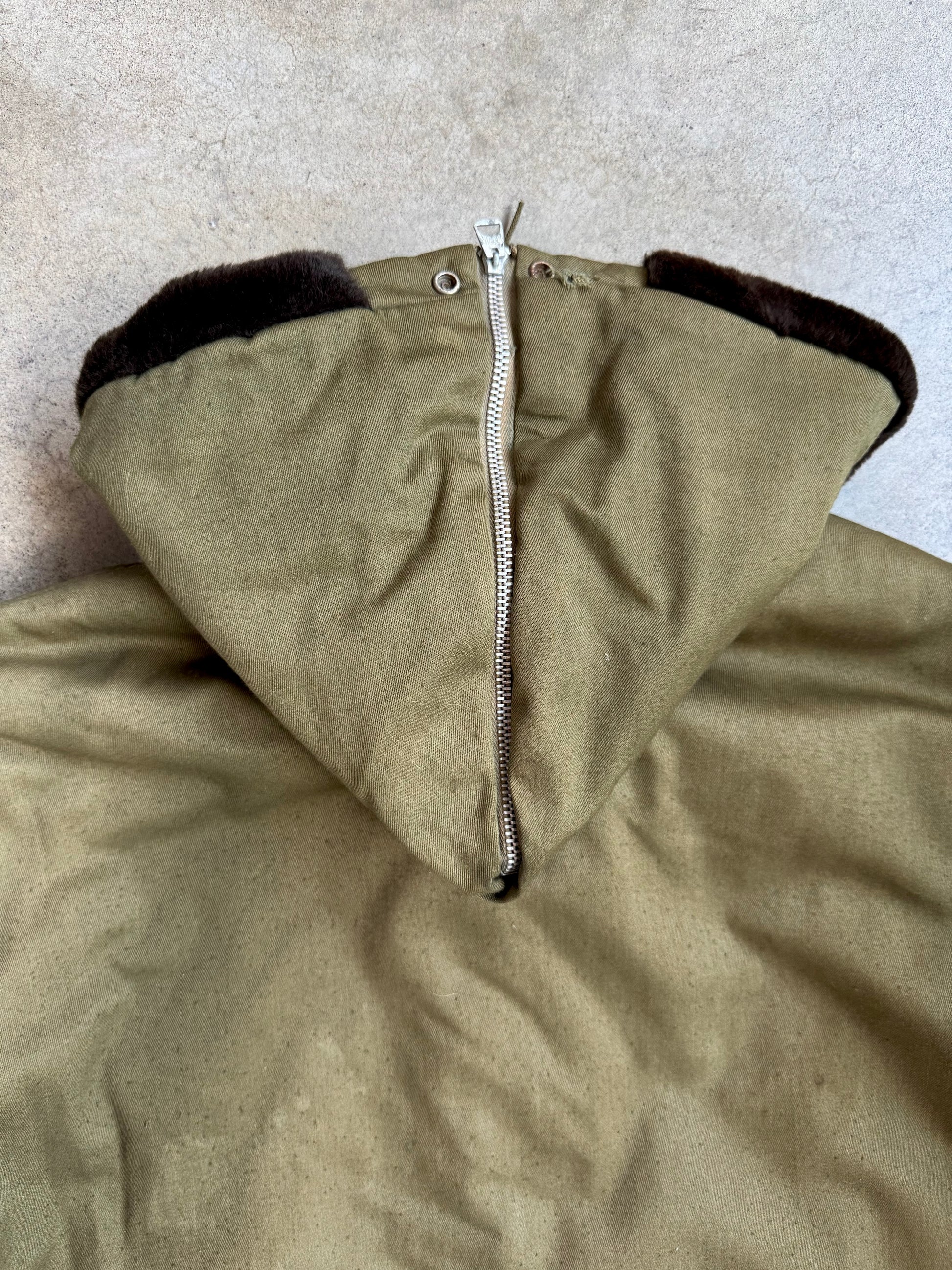 Vintage 1940s/50s Distressed Military Parka w/ Faux Fur Hood. Features a front zipper with fabric overlay for buttons (buttons have been removed), insulated quilt lining w/ rib knit sleeve cuffs.