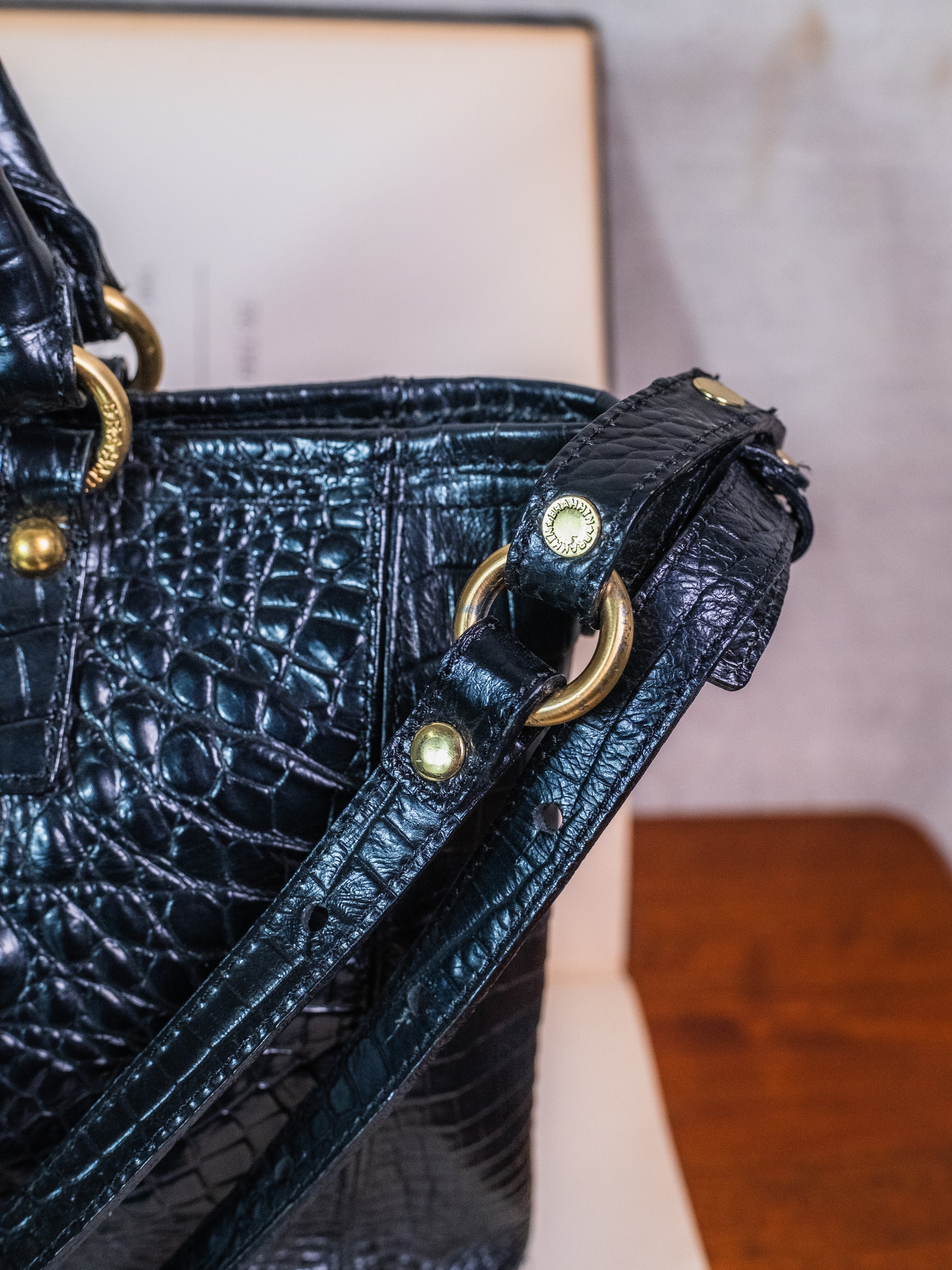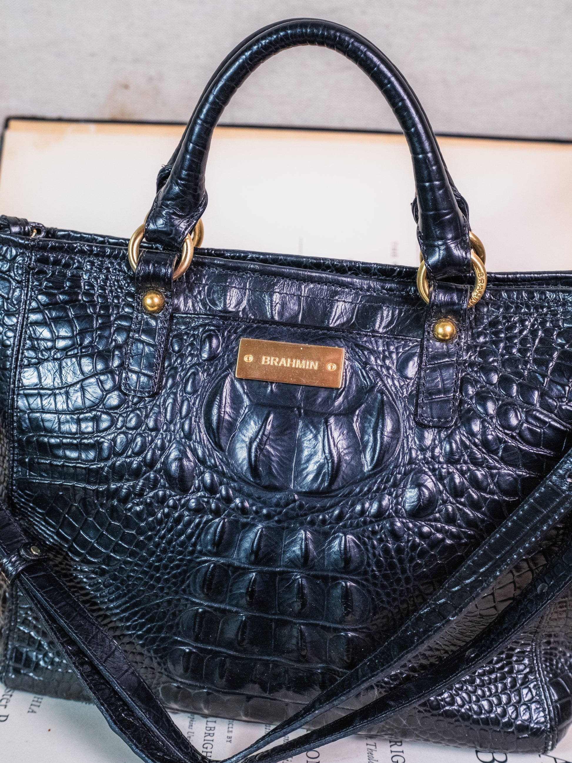 Brahmin Mini Arno Tote Black Croc-Embossed Leather Bag w/ Detachable & Adjustable Crossbody or Shoulder Strap.