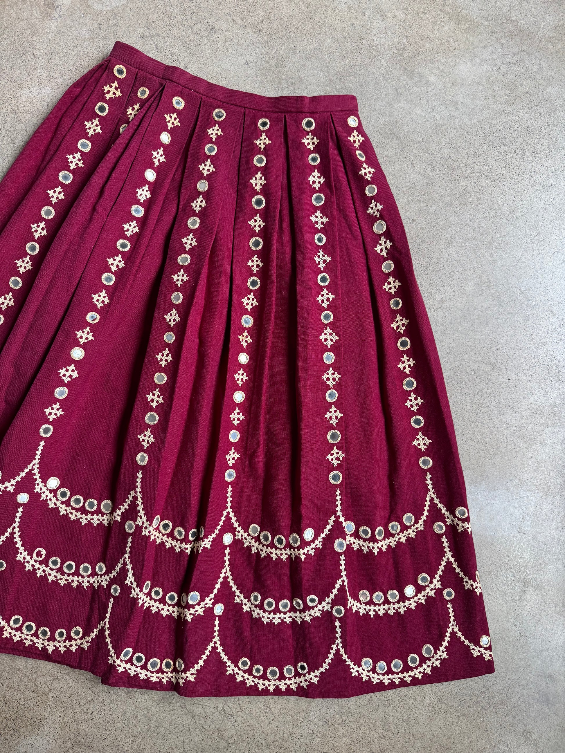 Vintage Burgundy Pleated Midi Skirt w/ Mirror Sequin Embroidery Detailing. Features a clasp closure at side of waist. Thick woven cotton fabric.