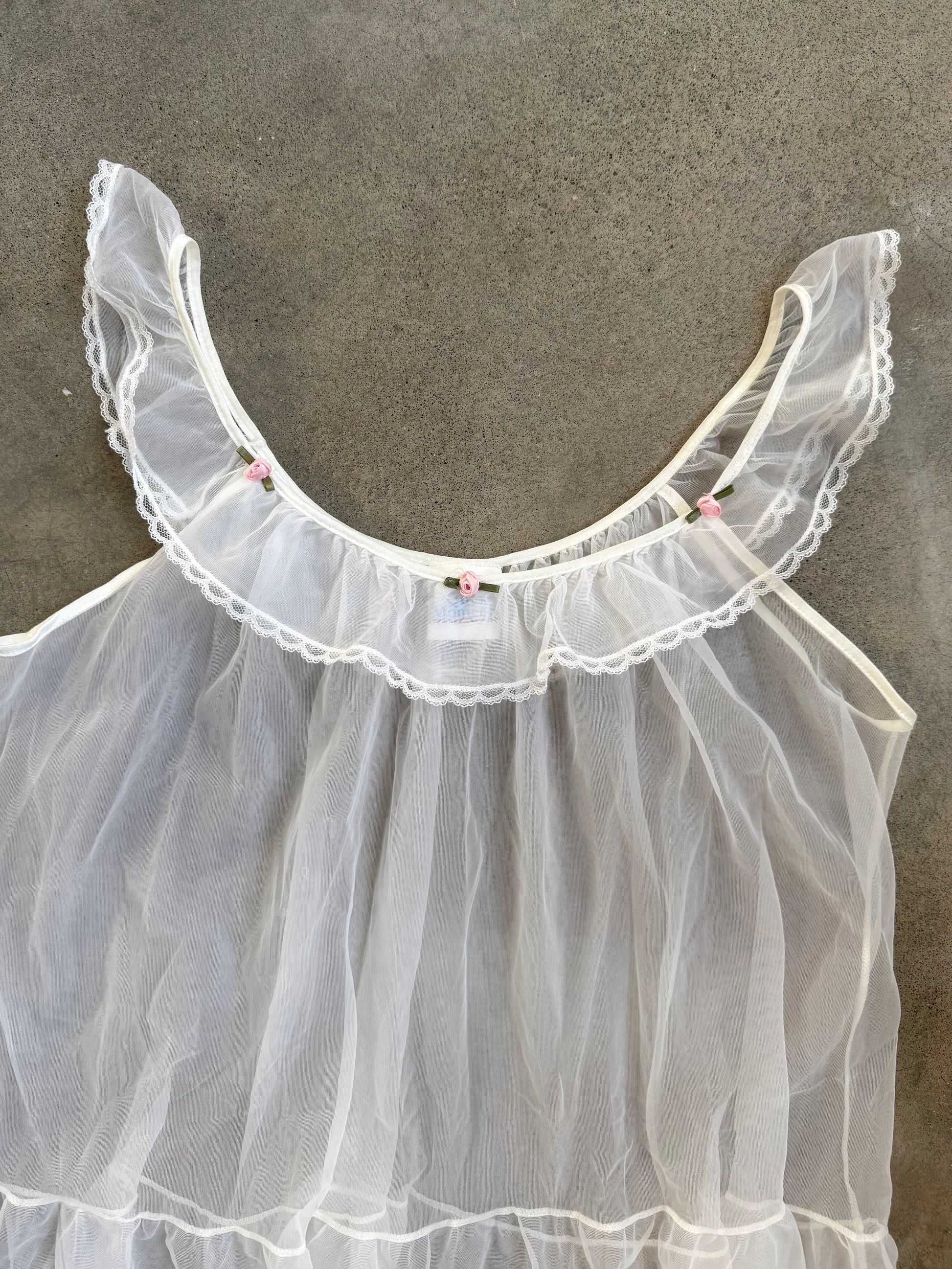 Vintage 1980s Quiet Moments White Sheer Babydoll Top w/ Lace Trim & Rosette Detailing.
